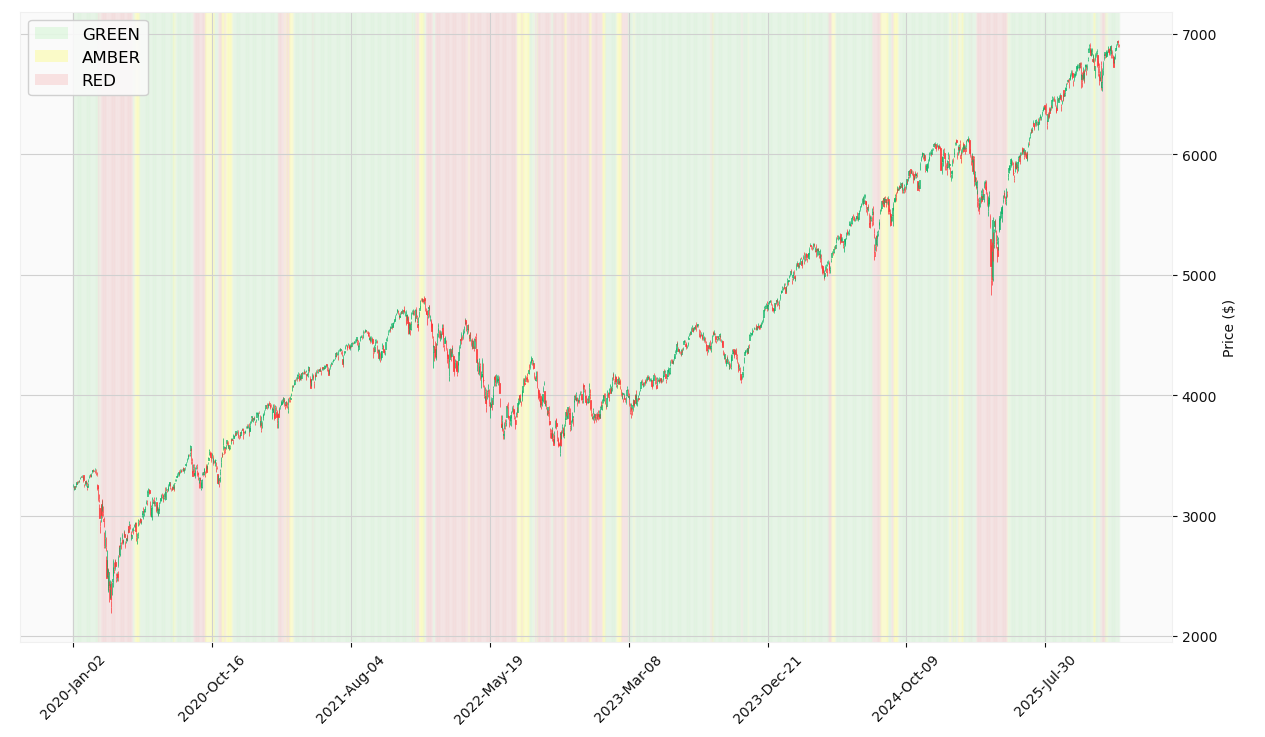 Below is our RAG system market regime detection from 2020-2025. The underlying is S&P500 index price chart.