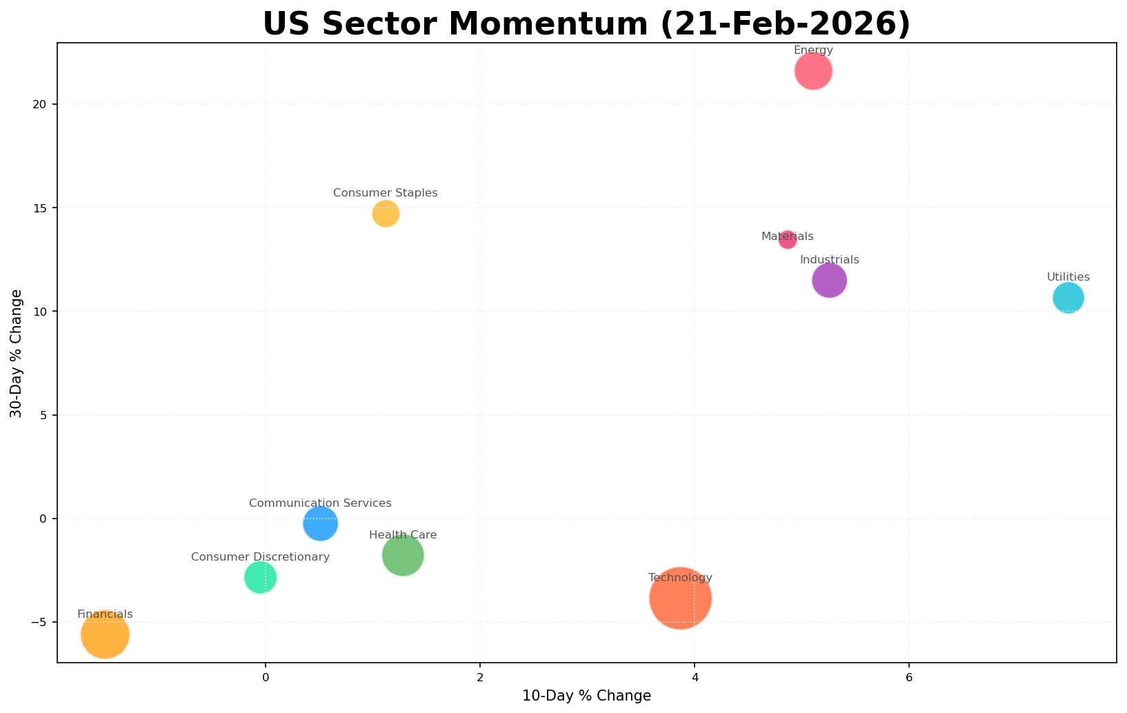 Cyclical sectors surged following the Supreme Court's tariff ruling, triggering a powerful risk-on rotation. Communication Services led with a 2.0% weekly gain, followed by Energy (+1.7%) and Industrials (+1.7%), as capital fled defensive positions.