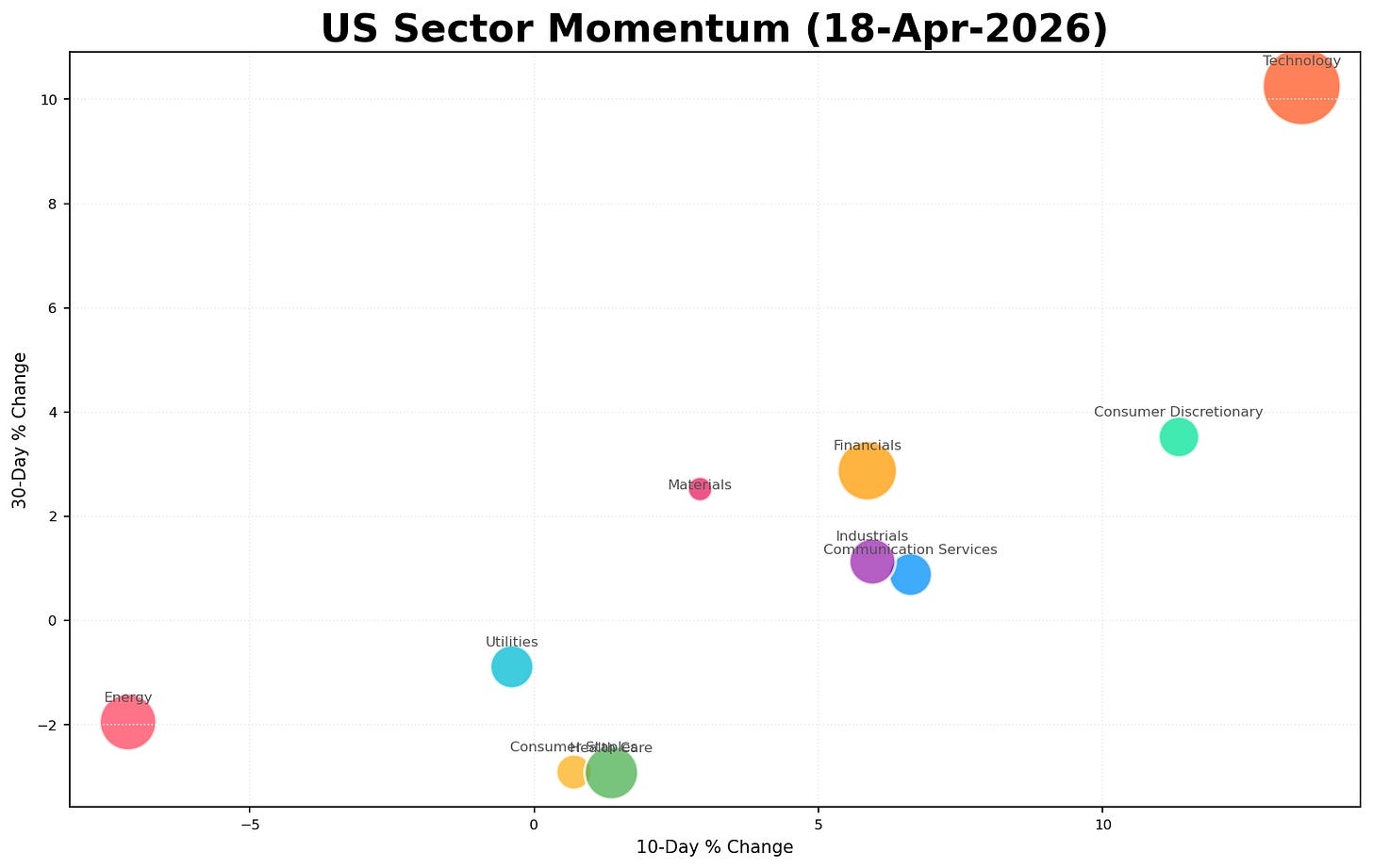 This week’s tape showed a clear rotation back toward growth inside a broader 2026 market still shaped by cross-asset sector flows. Earlier 2026 leadership had been dominated by Energy, Materials, Industrials, Staples, and Utilities while large-cap Technology cooled — but mid-April saw capital decisively rotating back into selected growth pockets.